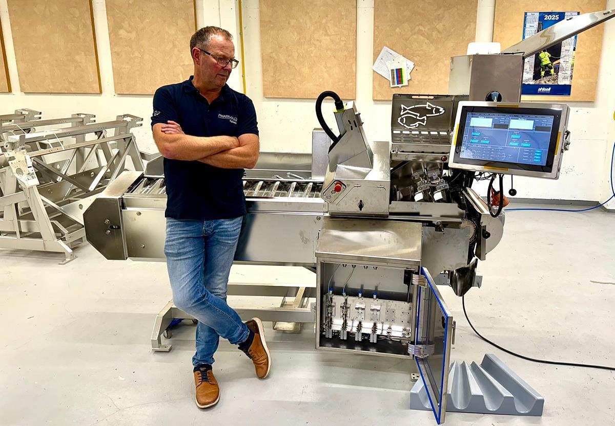 Jørn Ståle Pettersen viser fram en ny vaksineringsmaskin.
